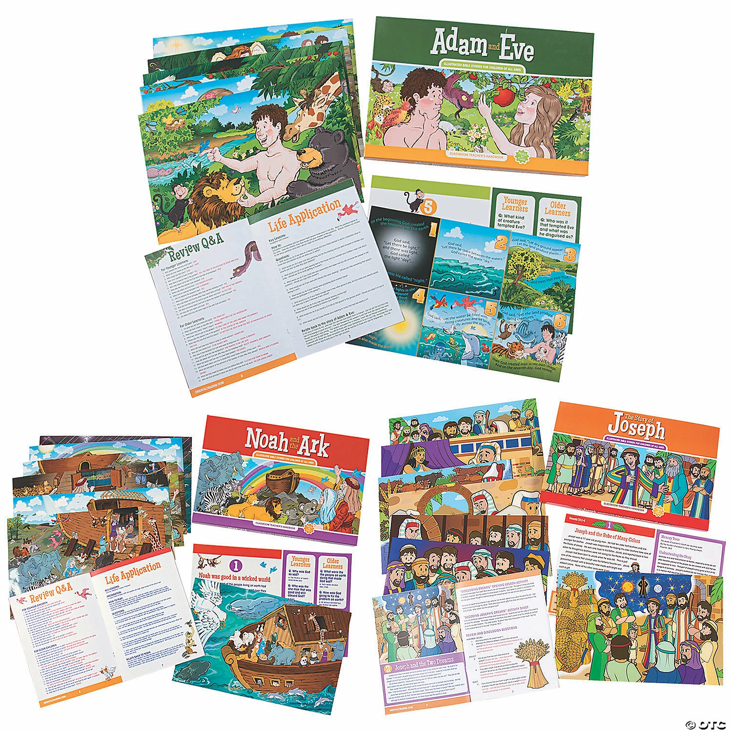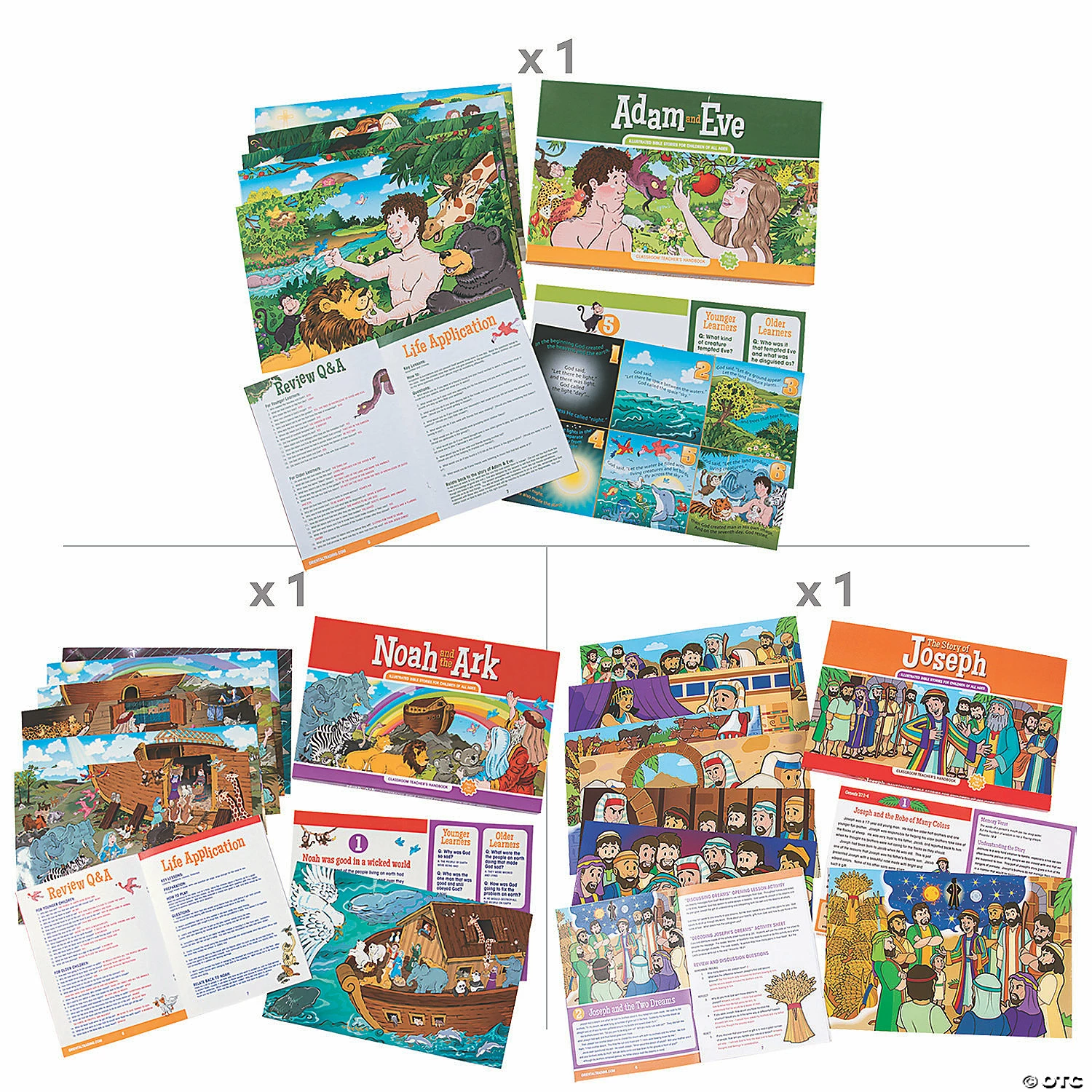 Teach your little ones about Christianity from the beginning with this Book of Genesis curriculum bundle. Perfect for homeschooling or as a Sunday School substitute, this religious education pack focuses on the Creation story, Noah & the Ark and Joseph & his robe of many colors. Each teacher companion set includes a classroom teacher’s handbook filled with scripture stories, Q&A, songs, reproducible activities & coloring sheet and game ideas; eight visual aid cards with a poster-sized image on the front and discussion prompts for various age levels on the back; and a sturdy storage box. Paper. (10 pcs. per set, 3 sets per unit) Cardboard boxes, 17″ x 11″ x 1″. ยฉ OTCIncludes:โข Creation Teacher Companionโข Noah & the Ark Teacher Companionโข Story of Joseph Teacher Companion