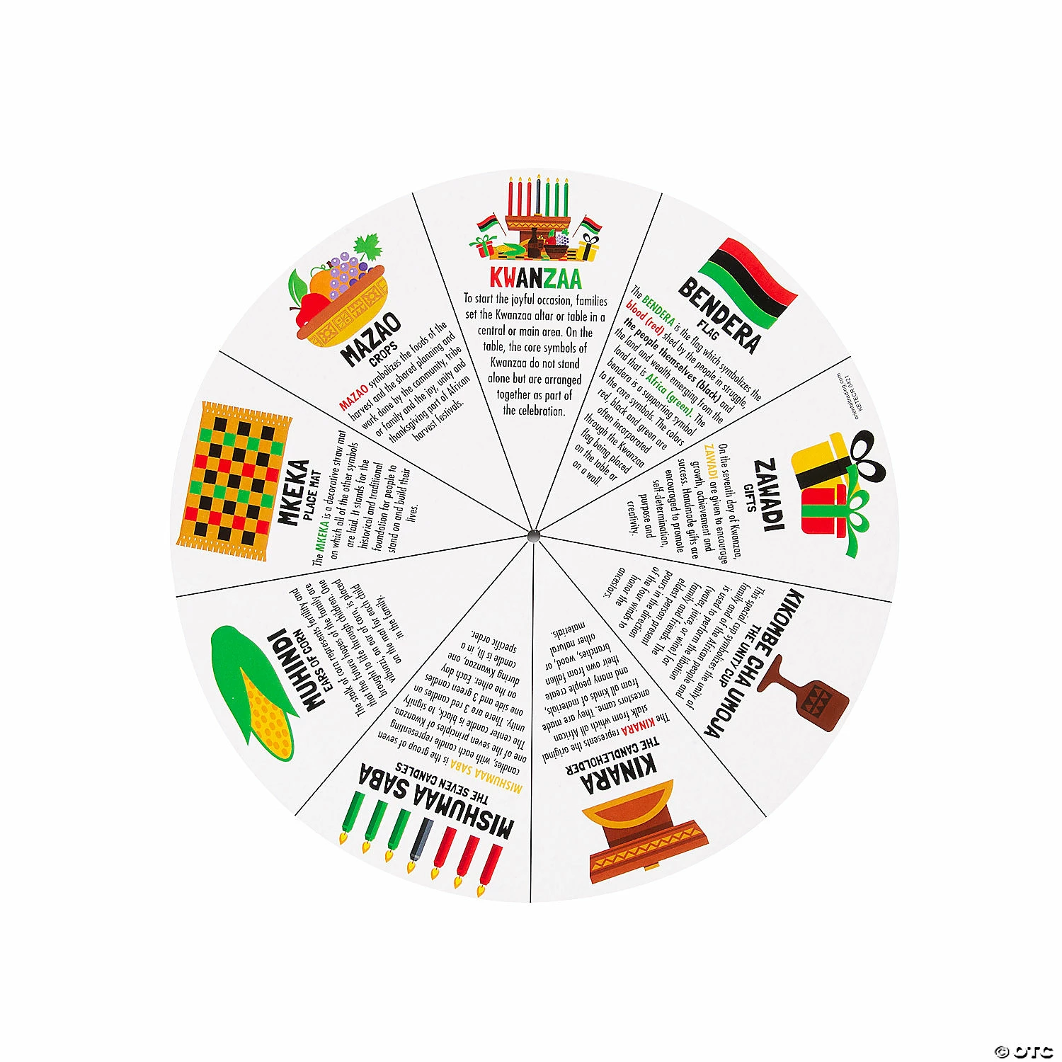 This fun educational activity is a great way to help children learn more about Kwanzaa! Featuring bright colors and a spinning wheel full of interesting information, break out this teaching aid to do together, or leave it with your brain break activities or indoor recess games to let students explore on their own. Cardstock with metal brad. 7″ diam. ยฉ OTC