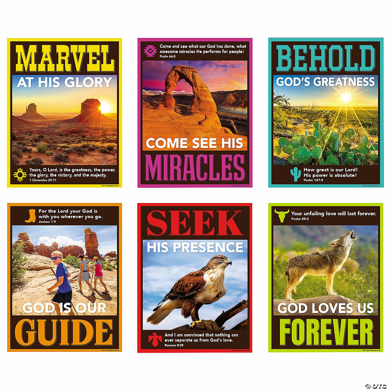 Add some color to your VBS classroom decorations! Perfect for Southwest VBS themes, these posters feature vibrant desert scenes and such inspirational sayings as โMarvel at His gloryโ and โSeek His presence.โ Each poster also includes a relevant Bible verse to help young believers learn as they soak in the sights. Cardstock. (6 pcs. per unit) 16″ x 20 3/4″ ยฉ OTC