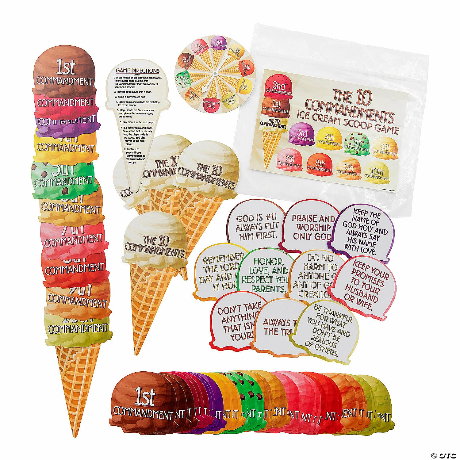 I scream, you scream, we all scream for Bible knowledge! This fun Bible game features ice cream scoop game pieces that each feature one of the 10 Commandments from the Old Testament. Players try to get their cone completed first by spinning the wheel and matching the scoop to the Commandment. A fun Sunday School game, this is also a game the entire family can play together to learn more about Godโs Commandments. Cardstock.ย (56 pcs.per unit) 4″ – 5″ x 3 1/2″ – 8 1/2″ game pieces in a 11 1/2″ x 10 1/4″ plastic storage bag. ยฉ OTC